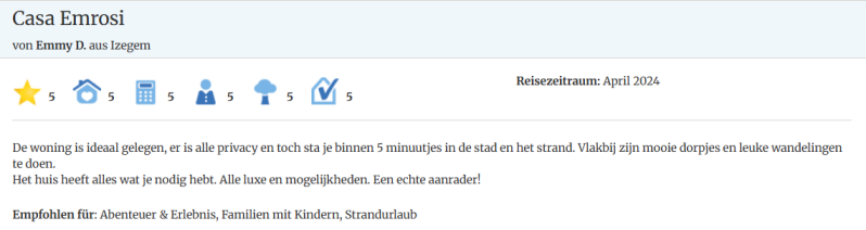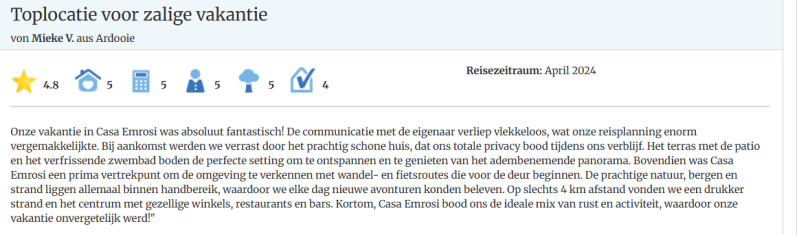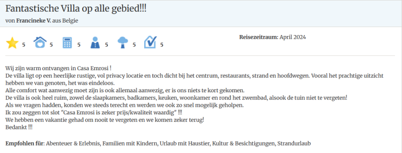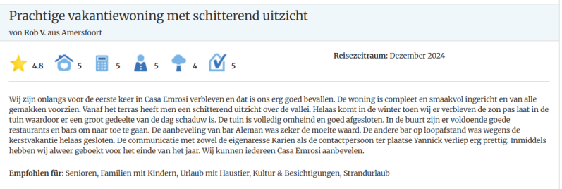 "De communicatie met Karien en met de sleutelbeheerder ter plaatse verliep heel prettig. Inmiddels hebben wij alweer geboekt voor volgend jaar. Wij kunnen iedereen Casa Emrosi aanbevelen. "